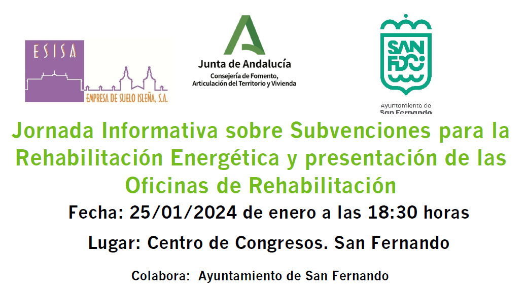 La Oficina de Rehabilitación de Andalucía, en colaboración con el Ayuntamiento de San Fernando celebrará una jornada divulgativa sobre subvenciones para la rehabilitación energética de viviendas.