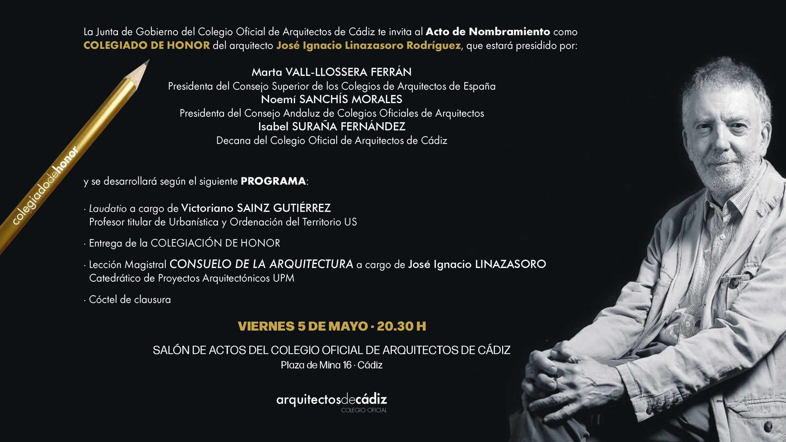 Conforme a lo previsto en el artículo 49 de los vigentes Estatutos del Colegio Oficial de Arquitectos de Cádiz, la Junta de Gobierno valorando y reconociendo la trascendental aportación de su obra a la Arquitectura Contemporánea y, de modo particular, su sensibilidad frente al espacio público y la intervención en contextos históricos y lugares con preexistencias, así como su compromiso para con este Colegio y el colectivo que representa, acuerda otorgar la distinción de Colegiado de Honor del Colegio Oficial de Arquitectos de Cádiz, al arquitecto D. José Ignacio Linazasoro Rodríguez.