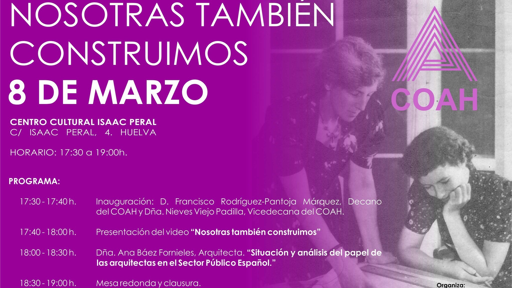 El Colegio Oficial de Arquitectos de Huelva, con motivo del Día de la Mujer, organiza una serie de actividades a desarrollar durante la tarde del día 8 de marzo, donde se presentará el video “La mujer en la Arquitectura”, que recopila las entrevistas realizadas a las colegiadas y trabajadoras del COAH con mayor antigüedad. Estos relatos nos ofrecen una visión del papel de la mujer en la época en que iniciaron su andadura laboral, de los avances conseguidos hasta hoy día y como ven el futuro próximo.