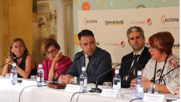 En la mesa de debate acompañaron a Noemí Sanchís el director de Desarrollo de Negocio de Servicios de la empresa ACCIONA, Alejandro Jiménez, la Secretaria General de la Federación Andaluza de Municipios y Provincias (FAMP) Teresa Muela, y Santiago Lorenzo, como director general de Movilidad del Ayuntamiento de Sevilla. La jornada giró en torno a cinco aspectos principales como la Contaminación, la Congestión en grandes ciudades, la lucha de las empresas contra el Cambio Climático, el BiG Data y el Cambio Cultural en la sociedad, en tanto población conectada y en relación al transporte compartido.