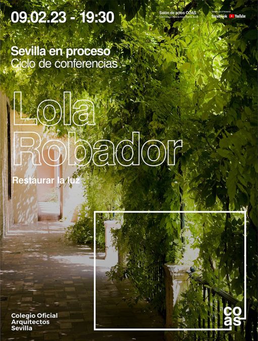 Hoy jueves 9 de febrero, dentro del ciclo de ponencias del COA de Sevilla “Sevilla en proceso”, nuestra compañera Lola Robador va a impartir la conferencia ‘Restaurar la luz’, en la que hará un recorrido por su trayectoria y analizará sus trabajos más destacados.