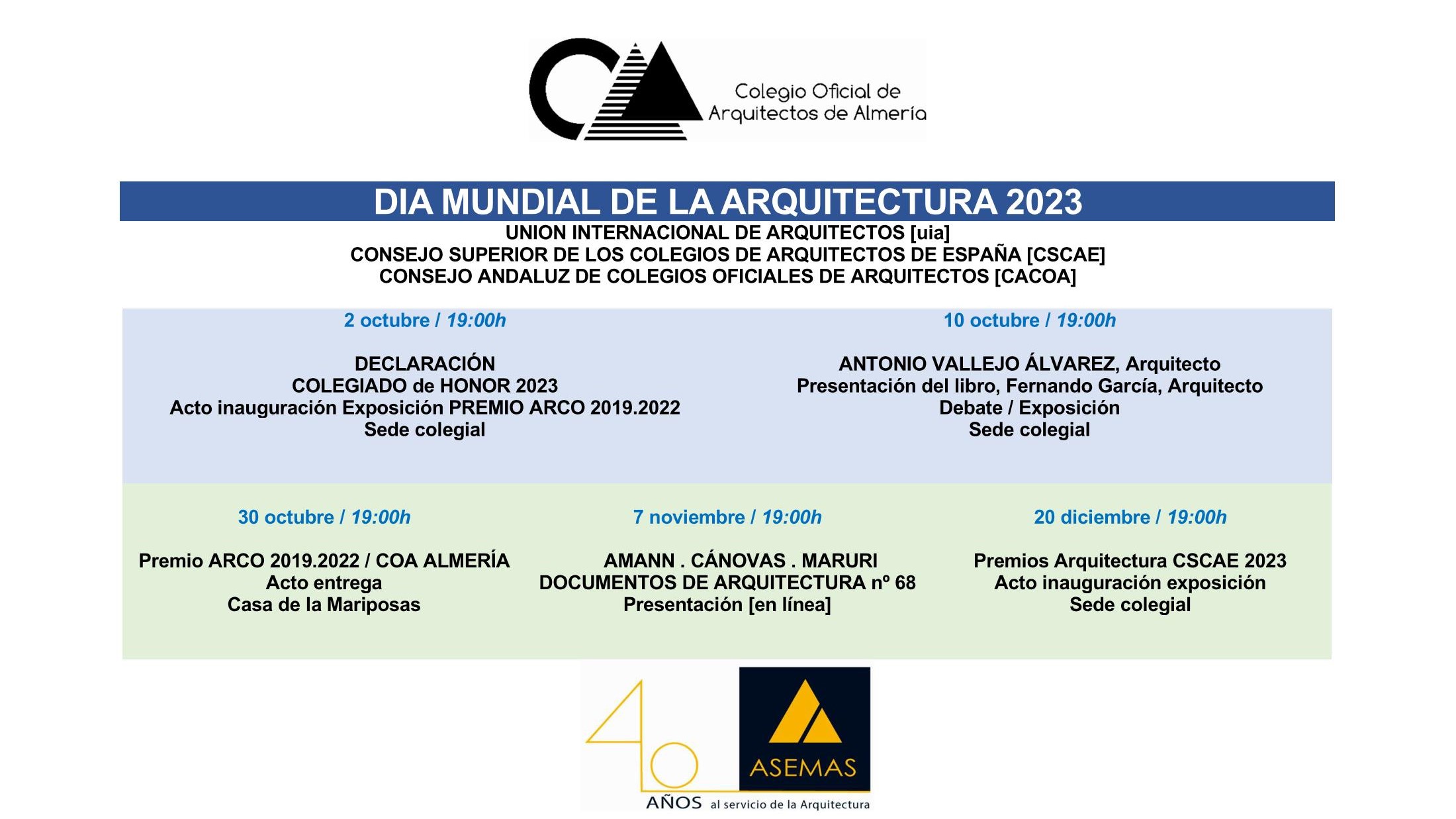 Desde el COA de Almería nos envían el programa de actos a celebrar durante la primera semana de octubre pro motivo de la celebración del Día Mundial de la Arquitectura.