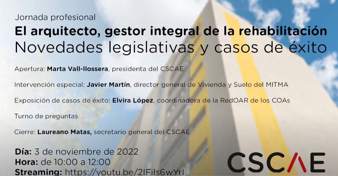 Para aquellos que no tuvieron ocasión de ver la participación del Director General de Vivienda y Suelo del Ministerio de Transportes, Movilidad y Agenda Urbana, D. Javier Martín, en la Jornada profesional “El arquitecto, gestor integral de la rehabilitación. Novedades legislativas y casos de éxito” organizada por el Consejo Superior de los Colegios de Arquitectos de España (CSCAE) en el marco de la “ola de renovación” impulsada con cargo a los fondos Next Generation.