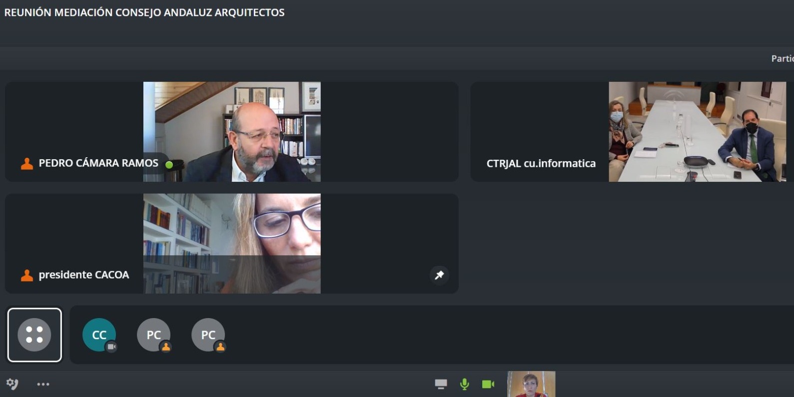 19/2/2021.- La presidente del Consejo Andaluz de Colegios Oficiales de Arquitectos Noemí Sanchís, junto a María José Agudo, como coordinadora del Grupo de Trabajo de Mediación del CACOA, mantuvieron una positiva reunión con los responsables de la Consejería de Justicia de la Junta de Andalucía para ahondar en las tareas de Mediación que vienen desarrollando los colegios provinciales de arquitectos adscritos a esta figura para la resolución de conflictos extrajudiciales.