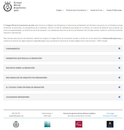 A día de hoy son cuatro los colegios provinciales de arquitectos que ya han implantado esta figura y están dados de alta como ‘Entidad de Mediación’, que son concretamente los de Jaén, Málaga, Sevilla y Huelva, ya que el propio CACOA, en tanto entidad de representación de los colegios provinciales no es entidad de mediación. Como muestra, adjuntamos más información sobre esta figura en el siguiente enlace del colegio jiennense: https://arquitectosdejaen.es/servicio-mediacion/