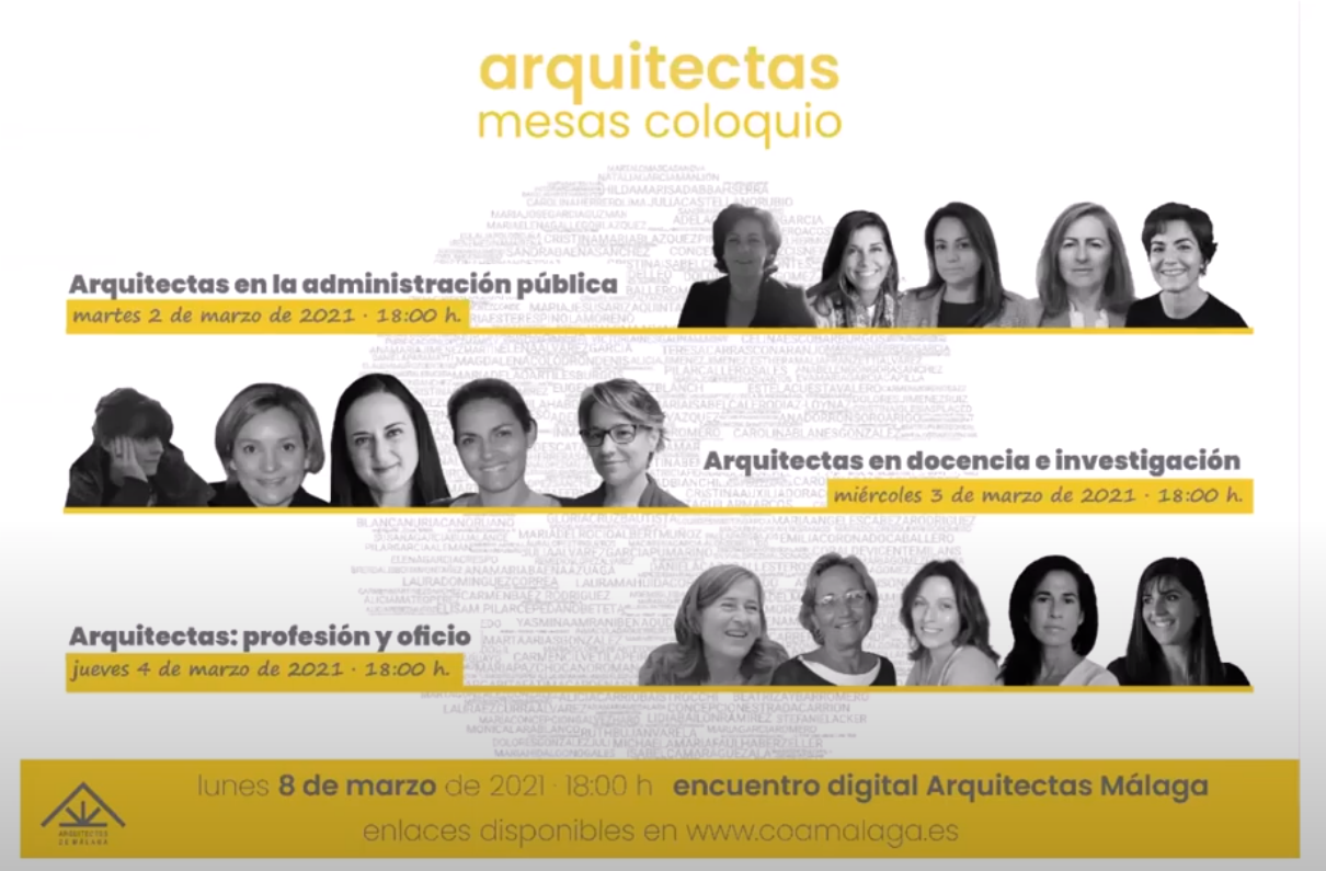 16/3/2021.- La presidente del Consejo Andaluz de Colegios Oficiales de Arquitectos (CACOA), Noemí Sanchís, participó junto al tesorero de la institución y decano del Colegio de Arquitectos de Málaga, Francisco Sarabia, y un buen grupo de arquitectas de dicha provincia, en la Mesa Redonda que con motivo del 8M ‘Día Internacional de la mujer’ tuvo por título ‘Encuentro digital de arquitectas’. Este debate fue el colofón a los tres coloquios que versaron respectivamente sobre ‘Las arquitectas en la administración pública’, ‘Las arquitectas en la docencia y la investigación’ y ‘las Arquitectas, profesión y oficio’. (Encuentros disponibles en la web oficial del COAMÁLAGA: http://coamalaga.es/agenda/actividad-cultural/dia-internacional-de-la-mujer-encuentro-digital-de-arquitectas/).