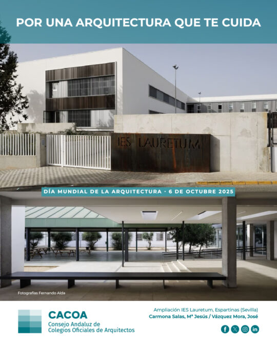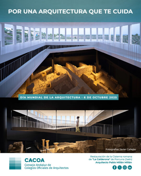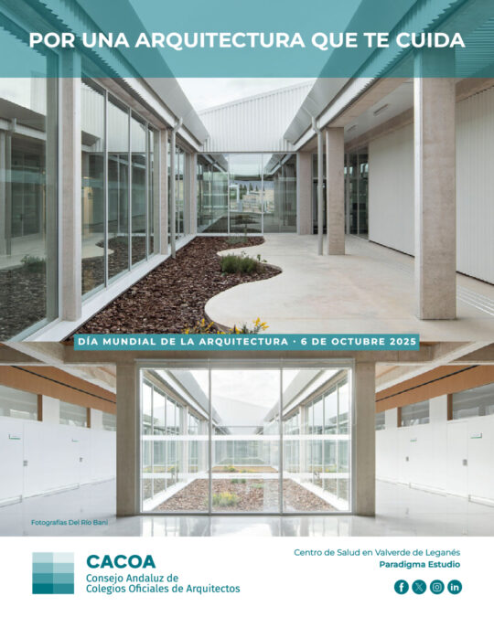 6 de octubre de 2025.– El Consejo Andaluz de Colegios Oficiales de Arquitectos (CACOA) se suma hoy a la conmemoración del Día Mundial de la Arquitectura 2025, bajo el lema ‘Una Arquitectura que te cuida’. La iniciativa enlaza con el enfoque internacional propuesto por la Unión Internacional de Arquitectos (UIA), que este año pone el acento en la resiliencia ante crisis urbanas, climáticas y sociales.