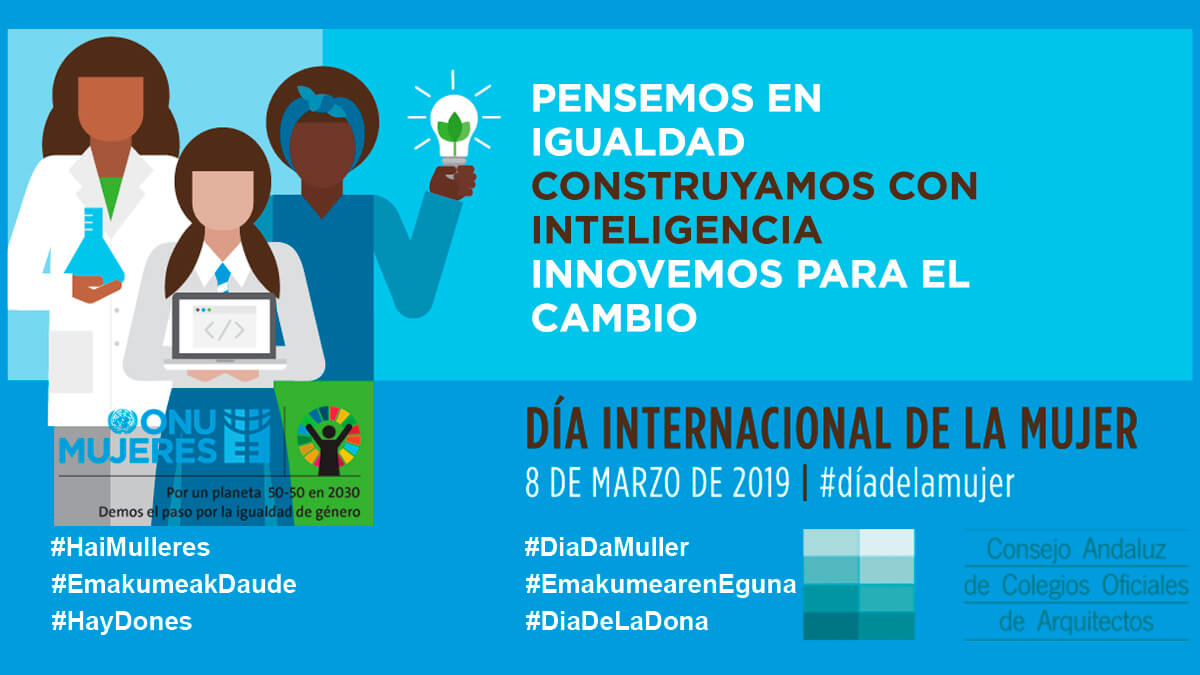 El Consejo Andaluz de los Colegios de Oficiales de Arquitectos (CACOA) y el Consejo Superior de Colegios de Arquitectos de España (CSCAE) se suman en este Día Internacional de la Mujer 2019 al lema propuesto desde ONU Mujeres: “Pensemos en igualdad, construyamos con inteligencia, innovemos para el cambio”. ONU Mujeres es la organización de las Naciones Unidas dedicada a promover la igualdad de género y el empoderamiento de las mujeres.