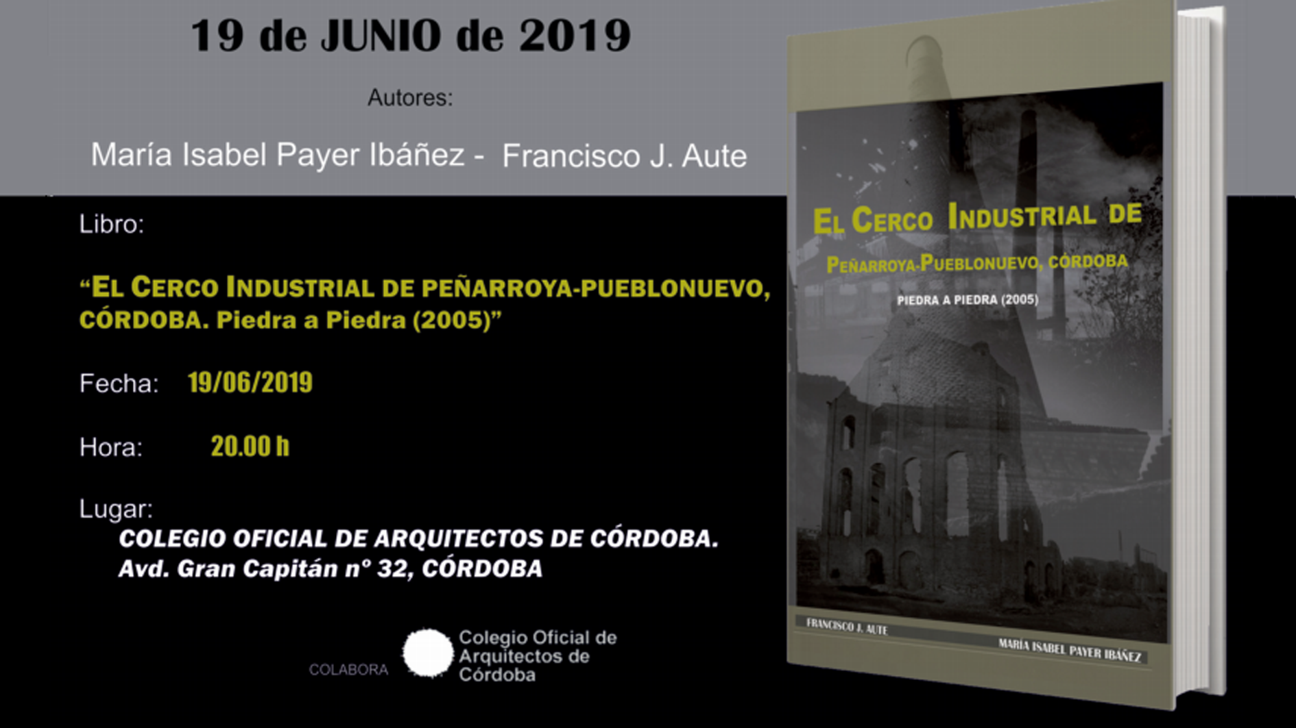 El próximo día 19 de junio, miércoles, a las 20:00 horas tendrá lugar en le Colegio Oficial de Arquitectos de Córdoba, la presentación del Libro: “El Cerco Industrial de Peñarroya-Pueblonuevo, Córdoba. Piedra a Piedra 2005”, cuyos autores son nuestra compañera María Isabel Payer y Francisco J. Aute, en la sala colegial.