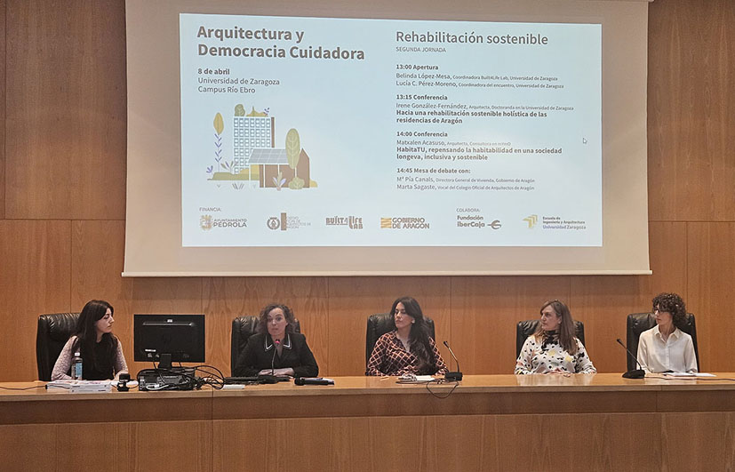 La segunda jornada, celebrada en la Escuela de Ingeniería y Arquitectura de la Universidad de Zaragoza, profundizó en la «Rehabilitación sostenible» de los centros residenciales existentes. Presentada por Belinda López-Mesa, co-IP del grupo de investigación Built4Life Lab, la sesión ofreció dos ponencias clave: Irene González-Fernández, arquitecta e investigadora predoctoral en la Universidad de Zaragoza, expuso casos de buenas prácticas y una propuesta de rehabilitación integral de las residencias aragonesas basada en criterios medioambientales, socioculturales y económicos. A continuación, Matxalen Acasuso, arquitecta y consultora en mYmO, presentó la guía «HabitaTU», enfocada en mejorar la habitabilidad de los espacios teniendo en cuenta la longevidad y la intergeneracionalidad. El debate posterior contó con la presencia de María Pía Canals, directora general de Vivienda del Gobierno de Aragón, y Marta Sagaste, vocal del Colegio Oficial de Arquitectos de Aragón, quienes coincidieron en la urgencia de políticas públicas que prioricen la adecuación del entorno construido a las nuevas realidades demográficas.
