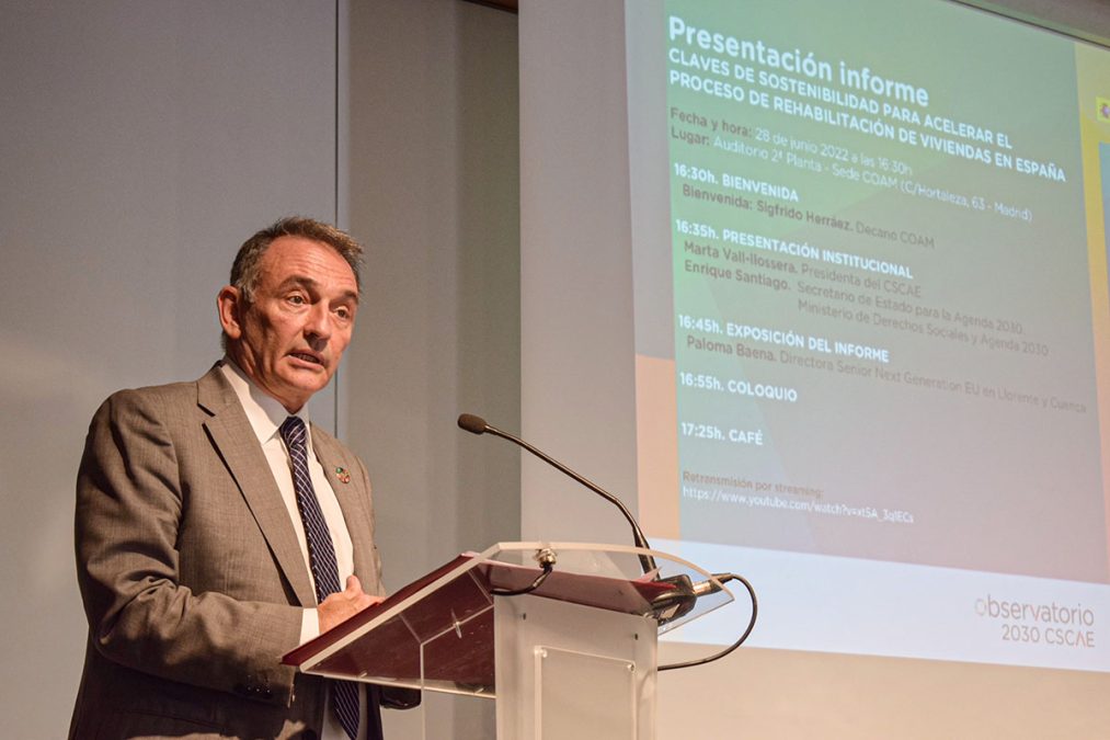 Tras la bienvenida del decano del Colegio Oficial de Arquitectos de Madrid (COAM), Sigfrido Herráez, la presentación del informe contó con las intervenciones institucionales del secretario de Estado para la Agenda 2030 del Ministerio de Derechos Sociales y Agenda 2030, Enrique Santiago, y la presidenta del CSCAE, Marta Vall-llossera.