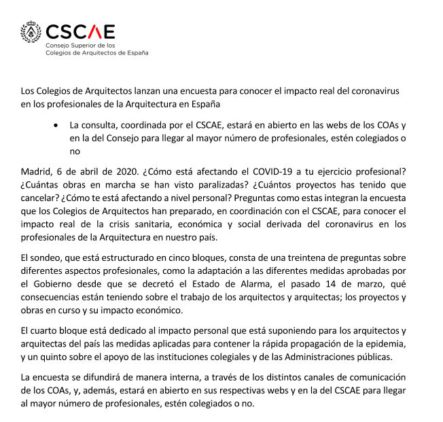 El CSCAE ha lanzado una encuesta para conocer el impacto real del coronavirus en los profesionales de la Arquitectura en España.