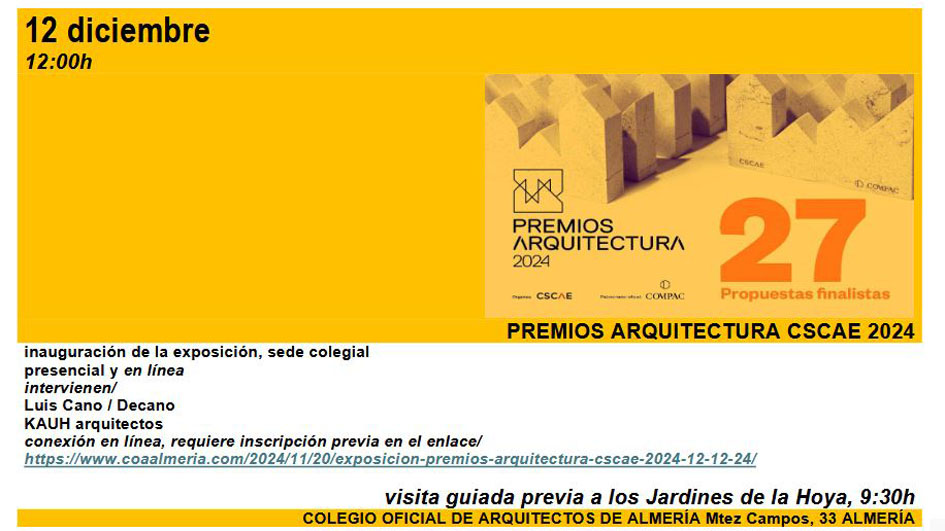 Cabe recordar que en la citada exposición se exhibe la premiada obra de los Jardines de la Hoya de KAUH Arquitectos así como el Museo de Almería de los Arquitectos Ángela García Paredes y Jorge García Pedrosa, recientemente galardonados con el Premio de Arquitectura 2023 del Ministerio de Vivienda y Agenda Urbana.