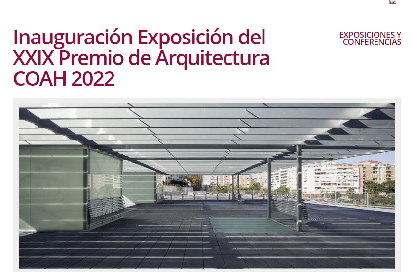 La Junta de Gobierno del Colegio Oficial de Arquitectos de Huelva tiene el placer de comunicarle la Inauguración de la Exposición del XXIX PREMIO DE ARQUITECTURA COAH 2022, que tendrá lugar el próximo jueves 2 de marzo, a las 19:00h, en la Sede del COAH, C/ Puerto nº 37 de Huelva, que precederá a la Conferencia de los Arquitectos ganadores de esta edición, Javier Terrados Cepeda y Fernando Suárez Corchete, dentro del ciclo "TRES OBRAS Y UN PROYECTO".