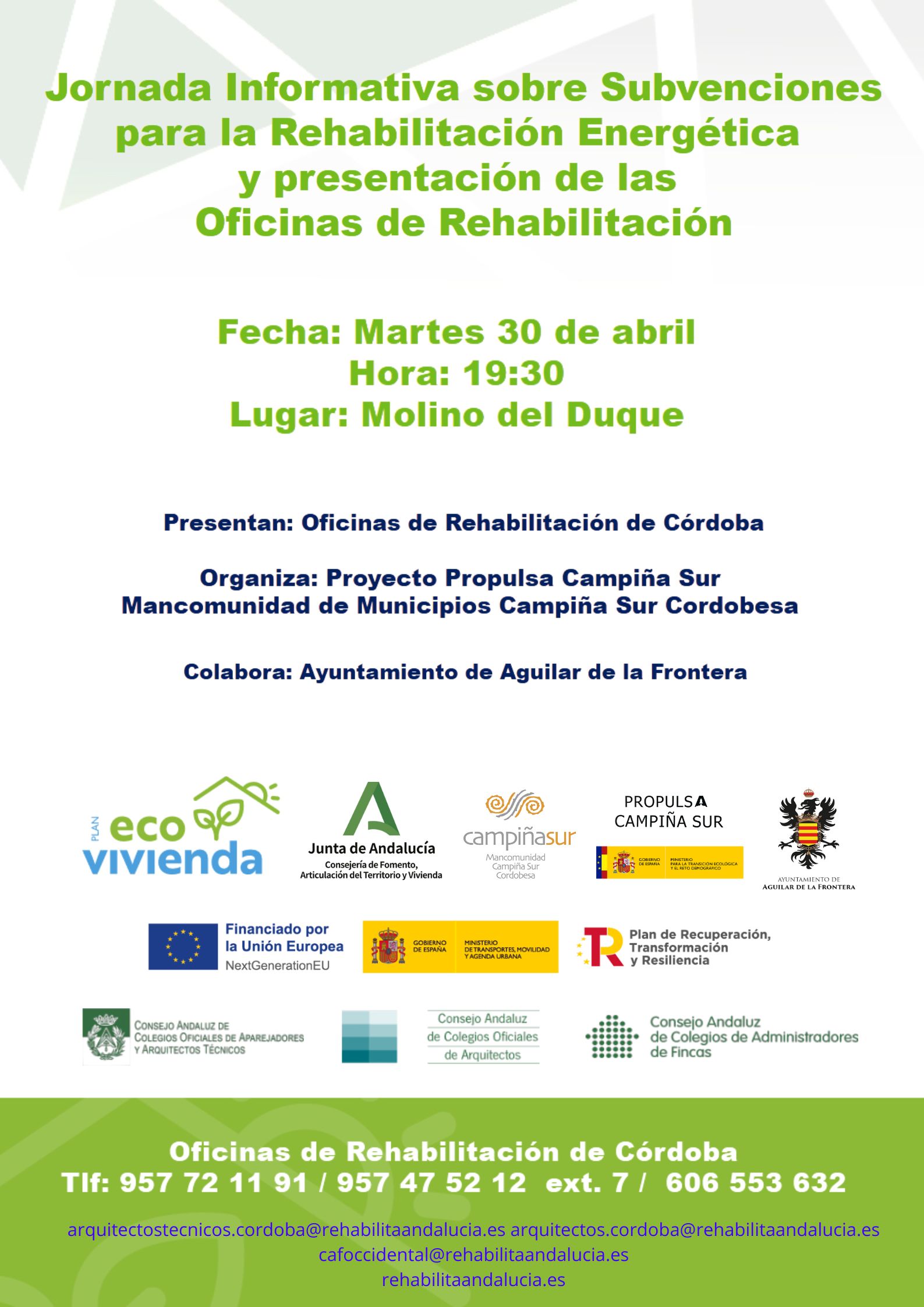 La Oficina de Rehabilitación de Andalucía, en colaboración con el Ayuntamiento de AGUILAR DE LA FRONTERA Y LA MANCOMUNIDAD CAMPIÑA SUR CORDOBESA celebrará una jornada divulgativa sobre subvenciones para la rehabilitación energética de viviendas.