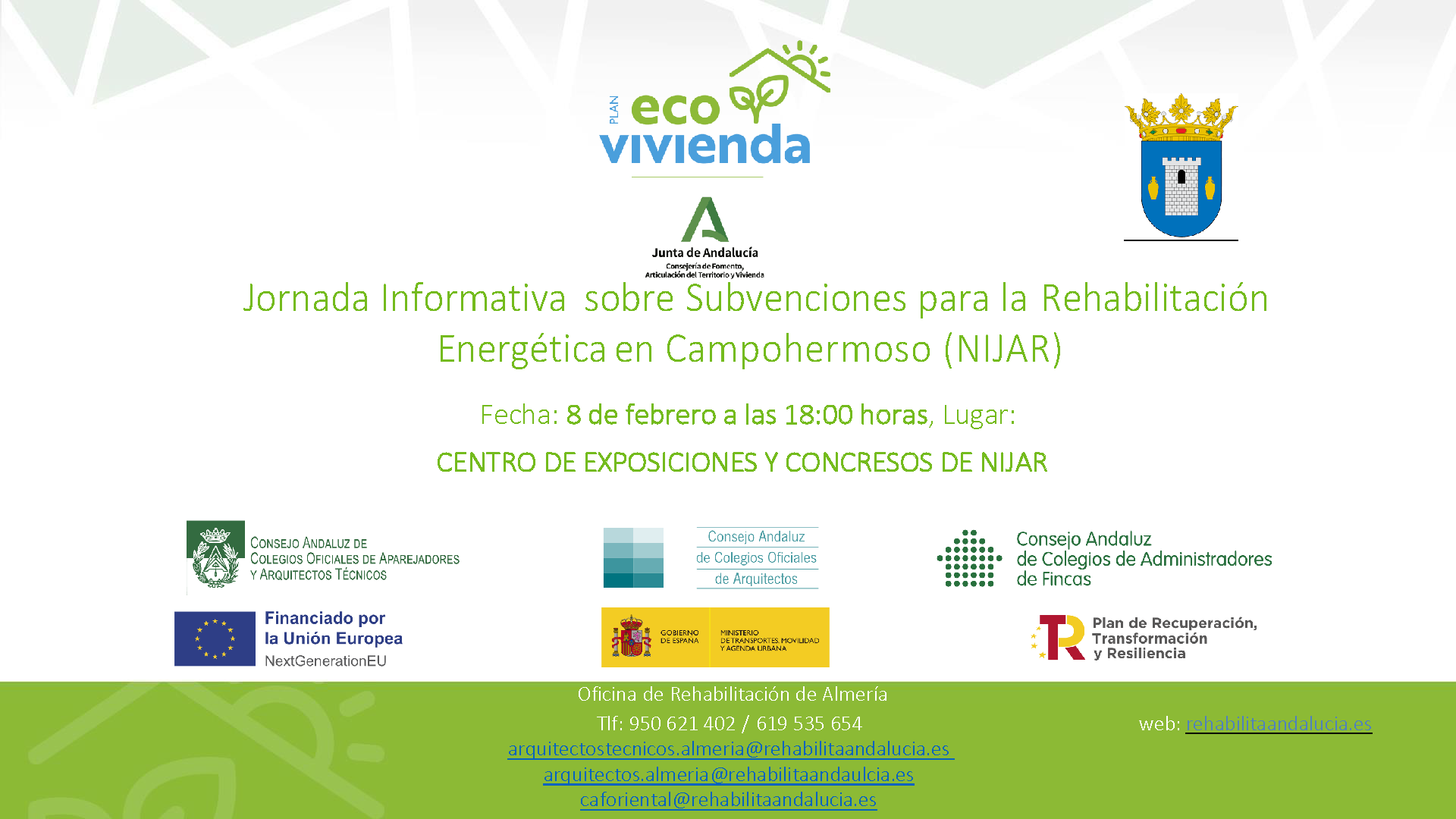 La Oficina de Rehabilitación de Andalucía, en colaboración con el Ayuntamiento de CAMPOHERMOSO - NÍJAR celebrará una jornada divulgativa sobre subvenciones para la rehabilitación energética de viviendas.