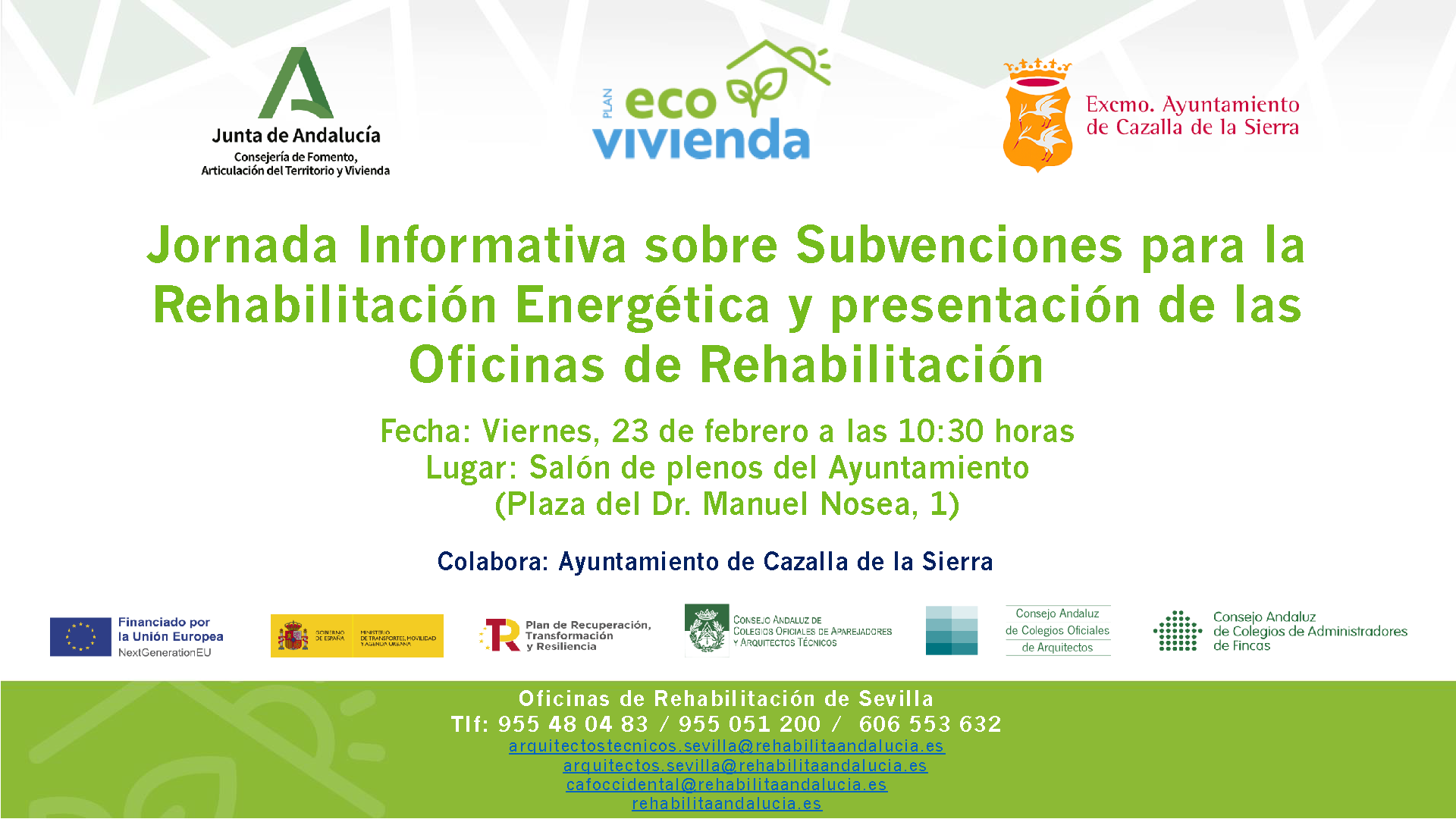 La Oficina de Rehabilitación de Andalucía, en colaboración con el Ayuntamiento de CAZALLA DE LA SIERRA celebrará una jornada divulgativa sobre subvenciones para la rehabilitación energética de viviendas.