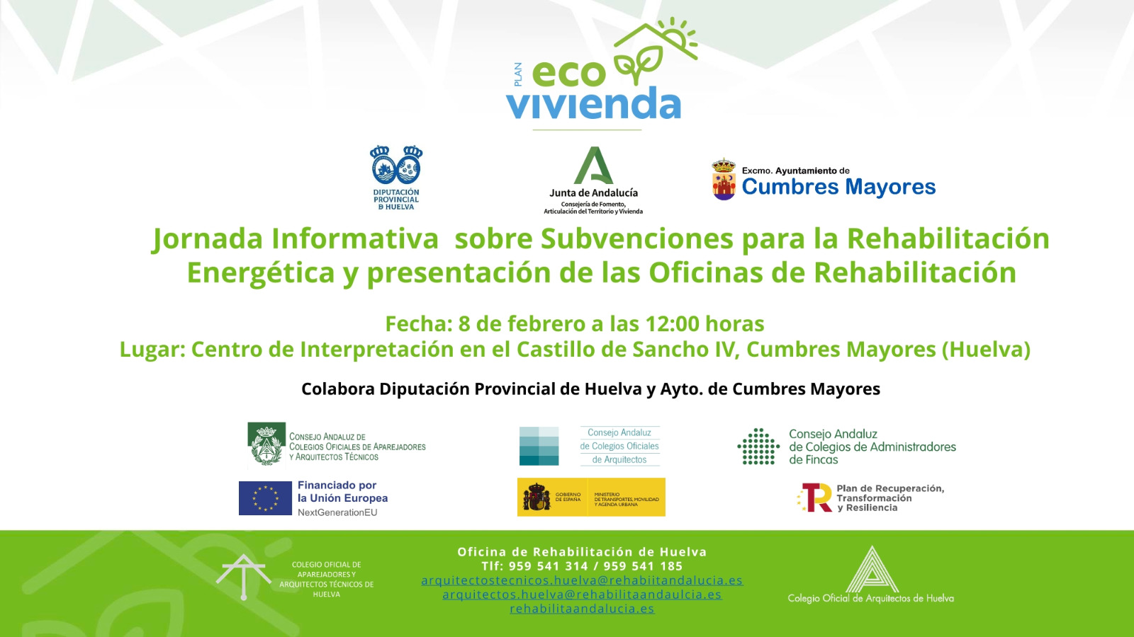 La Oficina de Rehabilitación de Andalucía, en colaboración con el Ayuntamiento de CUMBRES MAYORES celebrará una jornada divulgativa sobre subvenciones para la rehabilitación energética de viviendas.