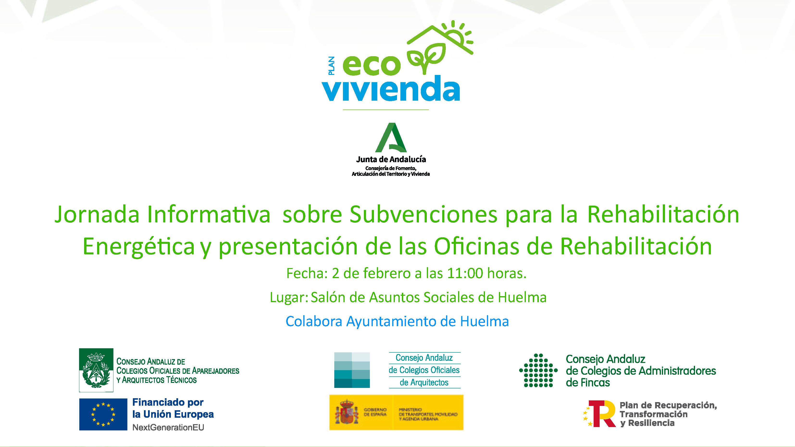 La Oficina de Rehabilitación de Andalucía, en colaboración con el Ayuntamiento de HUELMA celebrará una jornada divulgativa sobre subvenciones para la rehabilitación energética de viviendas.