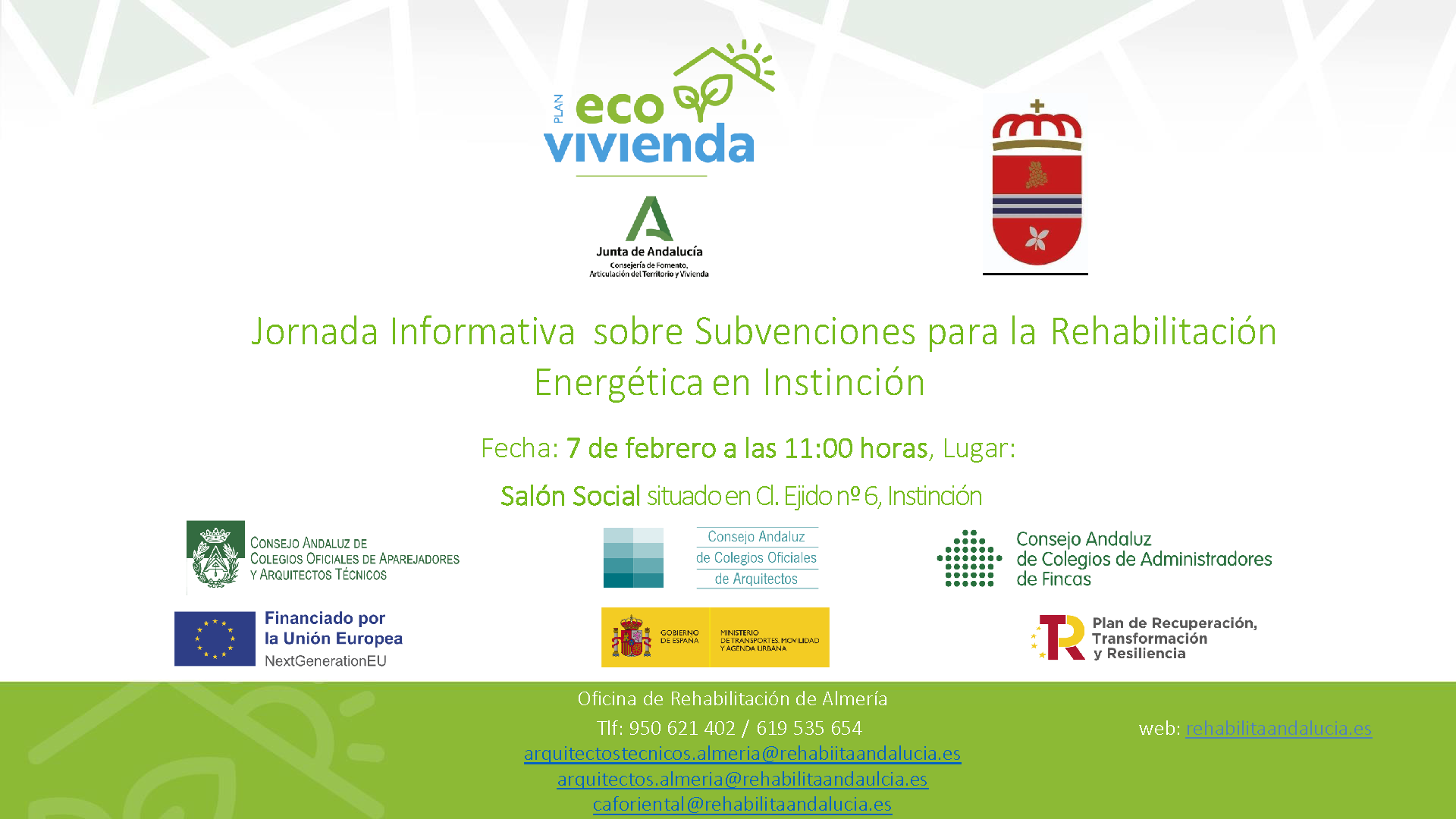 La Oficina de Rehabilitación de Andalucía, en colaboración con el Ayuntamiento de INSTINCIÓN celebrará una jornada divulgativa sobre subvenciones para la rehabilitación energética de viviendas.
