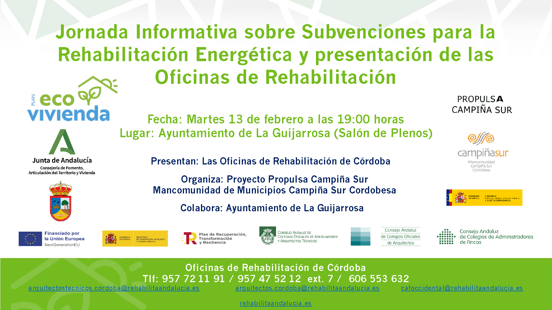 La Oficina de Rehabilitación de Andalucía, en colaboración con el Ayuntamiento de LA GUIJARROSA celebrará una jornada divulgativa sobre subvenciones para la rehabilitación energética de viviendas.