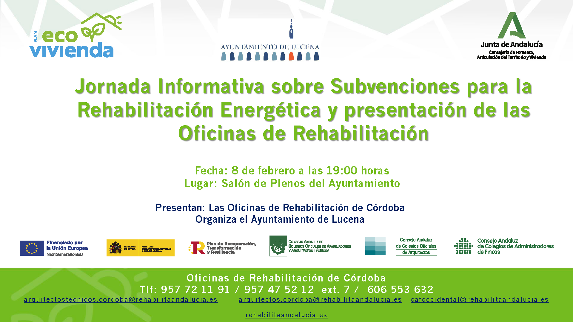 La Oficina de Rehabilitación de Andalucía, en colaboración con el Ayuntamiento de LUCENA celebrará una jornada divulgativa sobre subvenciones para la rehabilitación energética de viviendas.