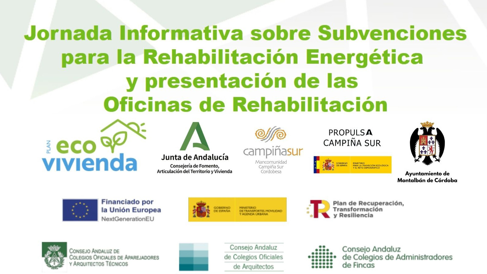 La Oficina de Rehabilitación de Andalucía, en colaboración con el Ayuntamiento de MONTALBÁN Y LA MANCOMUNIDAD DE LA CAMPIÑA SUR CORDOBESA celebrará una jornada divulgativa sobre subvenciones para la rehabilitación energética de viviendas.