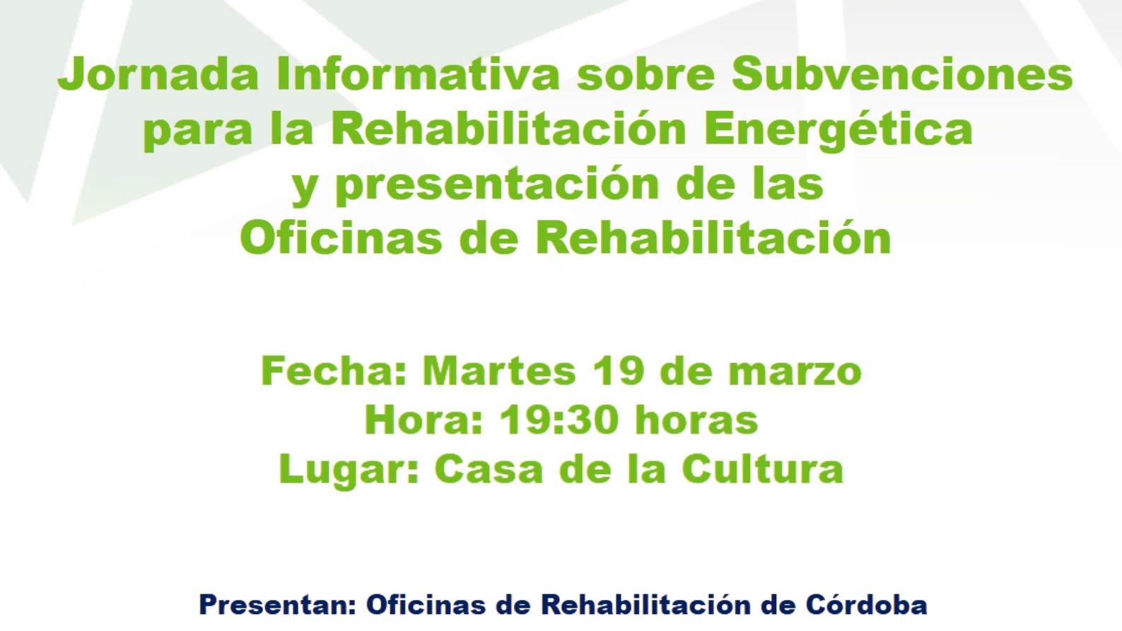La Oficina de Rehabilitación de Andalucía, en colaboración con el Ayuntamiento de MONTALBÁN Y LA MANCOMUNIDAD DE LA CAMPIÑA SUR CORDOBESA celebrará una jornada divulgativa sobre subvenciones para la rehabilitación energética de viviendas.
