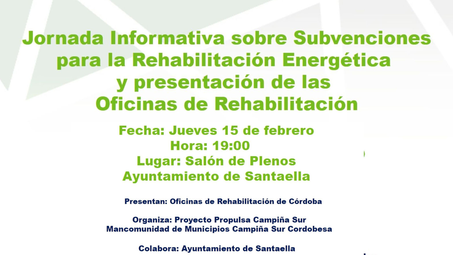 La Oficina de Rehabilitación de Andalucía, en colaboración con el Ayuntamiento de SANTAELLA celebrará una jornada divulgativa sobre subvenciones para la rehabilitación energética de viviendas.