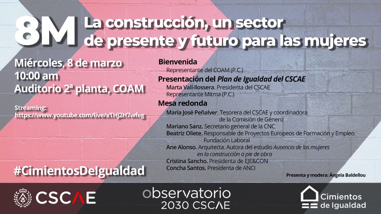"Cimientos de Igualdad", es una iniciativa lanzada por el Observatorio 2030 para fomentar la equidad de género y la atracción, promoción y retención del talento femenino al mundo de la construcción. En el marco de esta iniciativa, el Observatorio 2030 del Consejo Superior de los Colegios de Arquitectos de España (CSCAE) conmemorará, el próximo 8 de marzo a las 10h, el Día Internacional de la Mujer con un acto sobre el potencial de la construcción y, en particular, de la rehabilitación y el modelo sectorial que lleva aparejado para configurarse como un sector de presente y futuro para las mujeres.