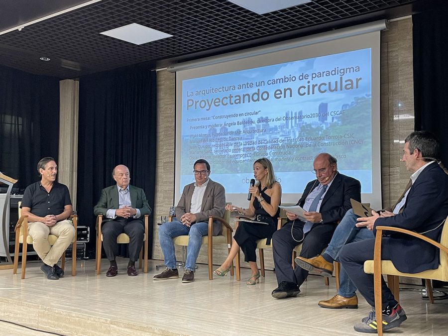 En la primera mesa redonda, titulada “Construyendo en circular” y moderada por la directora del Observatorio 2030 del CSCAE, Ángela Baldellou, se abordó, en profundidad, en qué se traduce la economía circular dentro del sector de la edificación y la construcción de la mano de estudios de arquitectura, de la industria de los materiales, de las promotoras inmobiliarias y de las empresas constructoras, con especial atención a la cadena de suministro y al papel de las pequeñas y medianas empresas (PYMES).