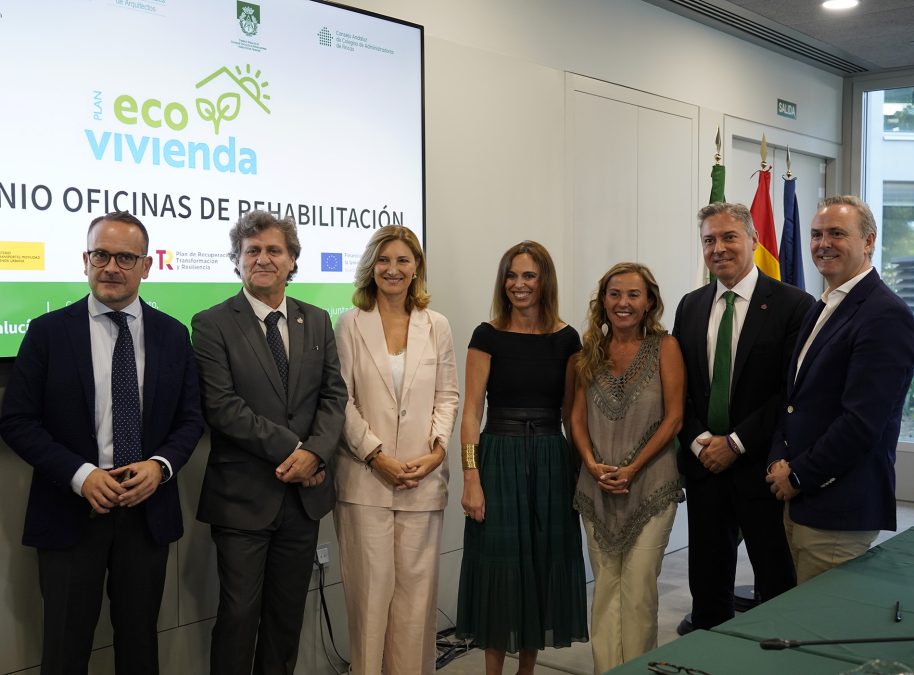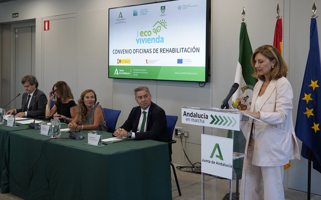 La consejera de Fomento, Articulación del Territorio y Vivienda de la Junta de Andalucía, Rocío Díaz, ha firmado con la presidenta del Consejo Andaluz de Arquitectos (CACOA), Noemí Sanchís; el presidente del Consejo Andaluz de Aparejadores y Arquitectos Técnicos, Jesús Lara; y el presidente del Consejo Andaluz de Colegios de Administradores de Fincas, José Feria, el convenio de colaboración para la constitución de oficinas de rehabilitación en las ocho provincias andaluzas que asesorarán a los solicitantes en la tramitación de las subvenciones.