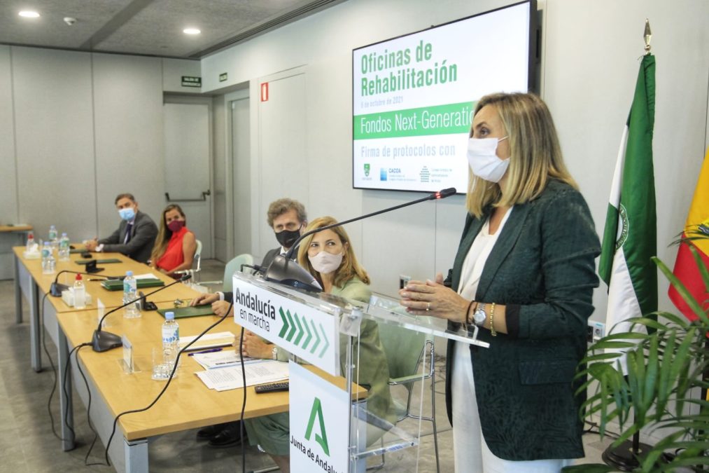 La consejera de Fomento, Marifrán Carazo, firmó con la presidente del Consejo Andaluz de Colegios Oficiales de Arquitectos, Noemí Sanchís; el presidente del Consejo Andaluz de Aparejadores y Arquitectos, Jesús Lara; y el presidente del Consejo Andaluz de Colegios de Administradores de Fincas, José Feria, un protocolo para colaborar en el asesoramiento a las comunidades de propietarios y así agilizar la tramitación de estas ayudas.