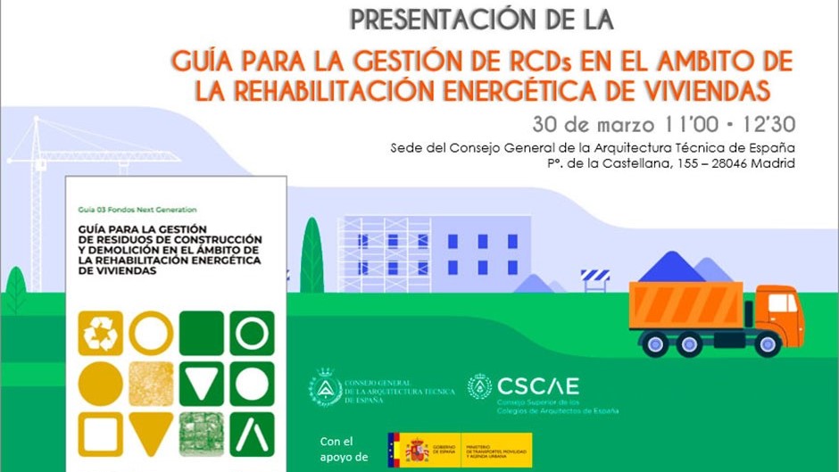 El próximo jueves 30 se presenta la 'Guía para la gestión de Residuos de la Construcción (RCDs) en el ámbito de la rehabilitación energética de viviendas', impulsada por el Consejo General de la Arquitectura Técnica de España (CGATE) y el Consejo Superior de los Colegios de Arquitectos de España (CSCAE).