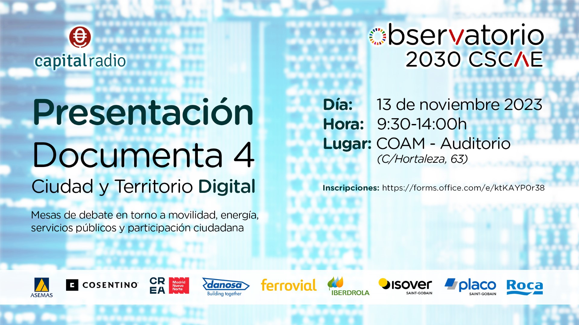 El acto tendrá lugar el lunes, 13 de noviembre a las 9:30h, en el COAM (C/Hortaleza, 63 - Madrid).