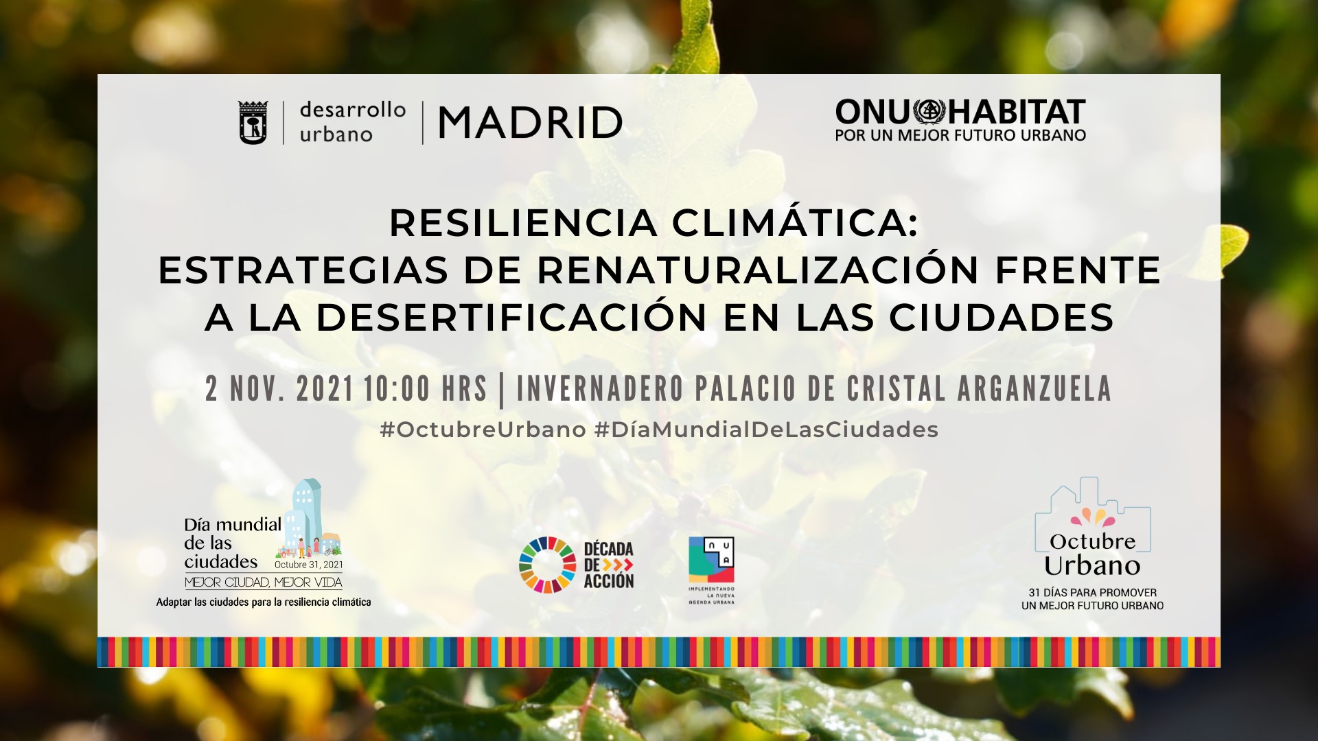 En el marco del Día Mundial de las Ciudades, el 2 de noviembre (10 hrs.) el Ayuntamiento de Madrid y ONU-Hábitat organizan el evento “Resiliencia climática: estrategias de renaturalización frente a la desertificación en las ciudades”en el que se debatirá sobre el papel de las ciudades en la lucha contra la desertificación, exponiendo nuevas formas de actuar en el espacio urbano y compartiendo experiencias e ideas innovadoras para convertir a las urbes en parte activa de la adaptación y respuesta frente a los procesos de desertificación.