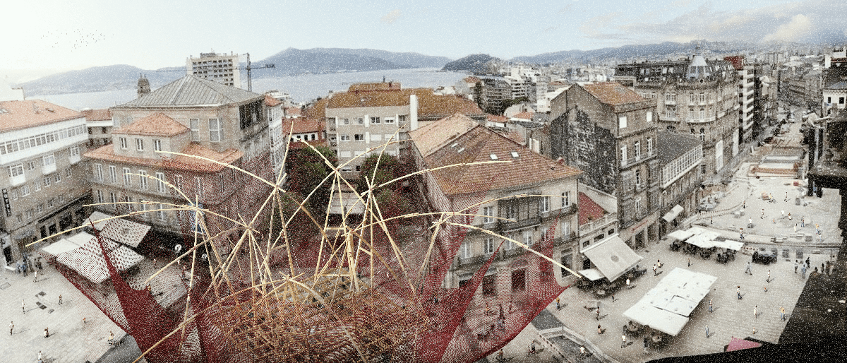¡Que faena(r)! plantea en la Puerta del Sol de Vigo un encuentro entre naturaleza y artificio, tradición y mediación a través de la estructura de la batea —plataforma de madera que se coloca en el mar para la cría y cultivo de moluscos y mejillones y elemento muy vinculado al territorio ya su economía local—, a la que se suma una cubierta que alude al sistema de pesca tradicional como reclamo y cobijo de actividades.